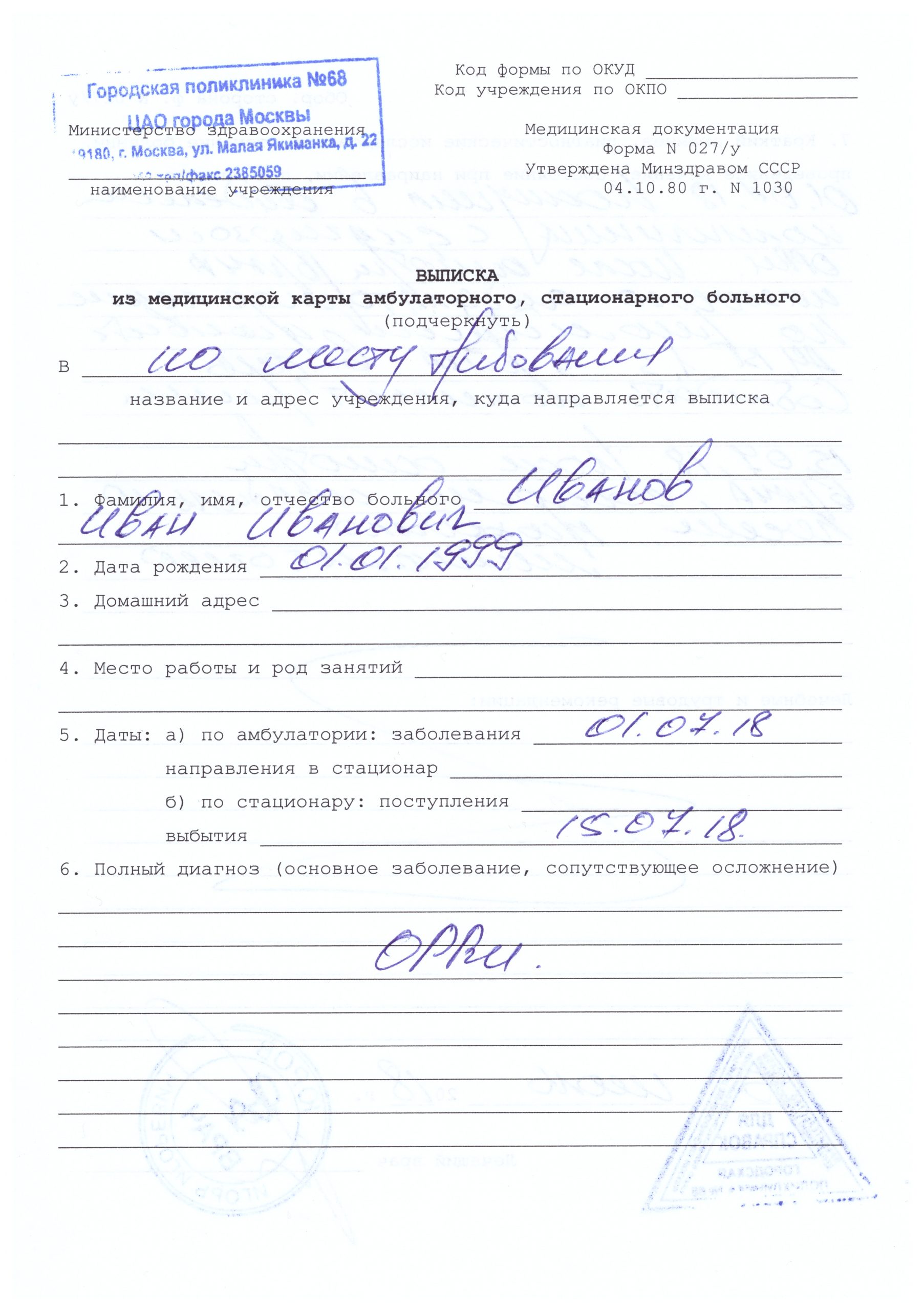 Любая выписка официальная из медицинской карты 027у оформляется очень быстро. Все желающие могут перезвонить в наш сервис по указанным на сайте номерам телефонов или оформить обратный звонок. Администраторы принимают заявку, заполняют бланк личными данными. Выписка 027 у будет содержать все необходимые сведения: