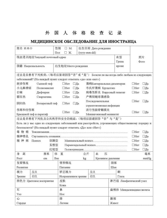 В обязательном порядке придется пойти на химико-токсикологическое исследование для выявления наркотиков в организме. К такому анализу надо подготовиться для того, чтобы исключить получение непредвиденных результатов. Кроме того, большинство российских клиник не способно выдать документ на китайском языке, как того требует страна прибытия. Поэтому, после прохождения комиссии вам придется перевести заключение, заверить его нотариально и легализовать.